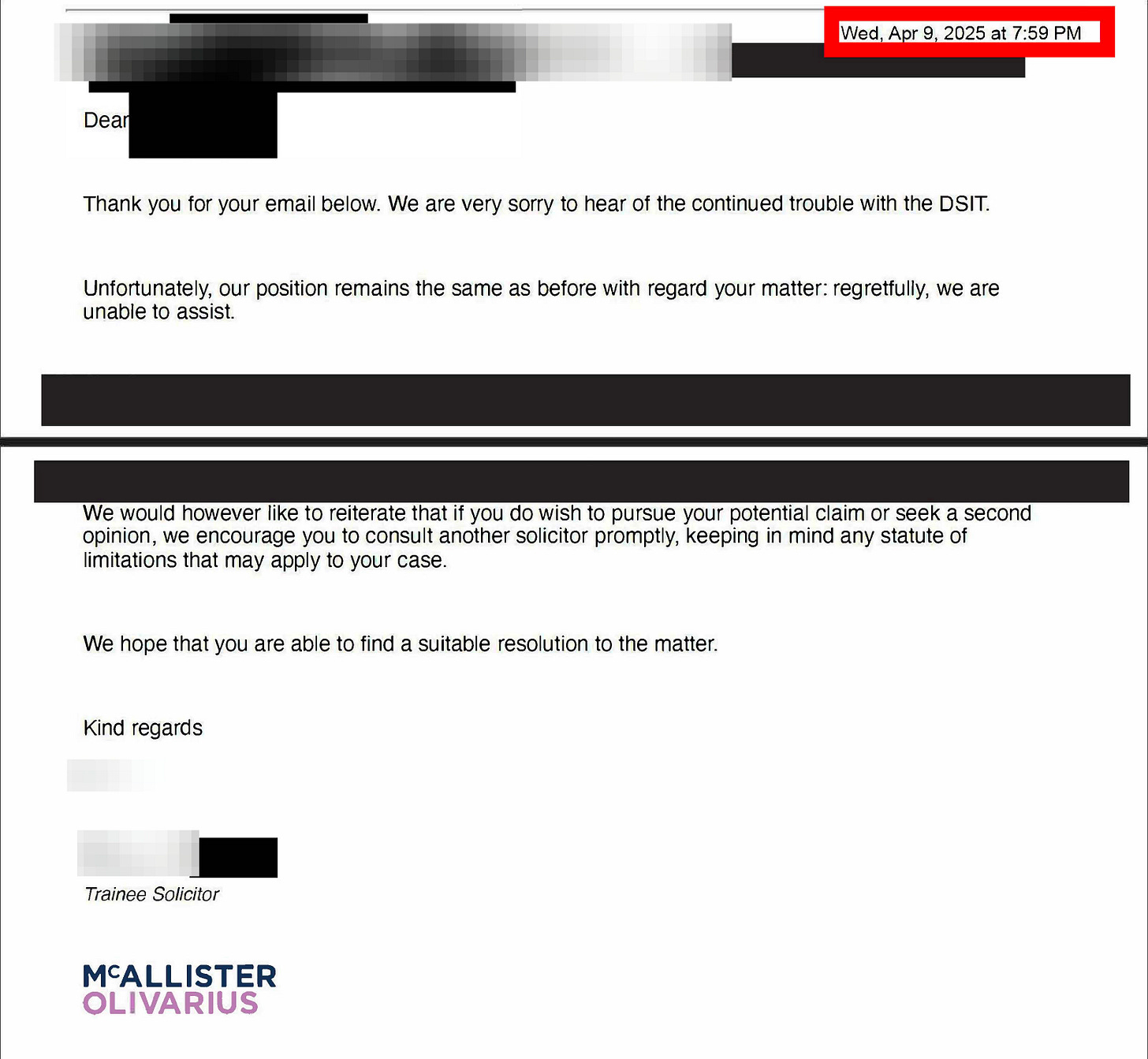 On Wednesday 9th April at at 19:59, I received email from a law firm acknowledging ongoing issues with DSIT: